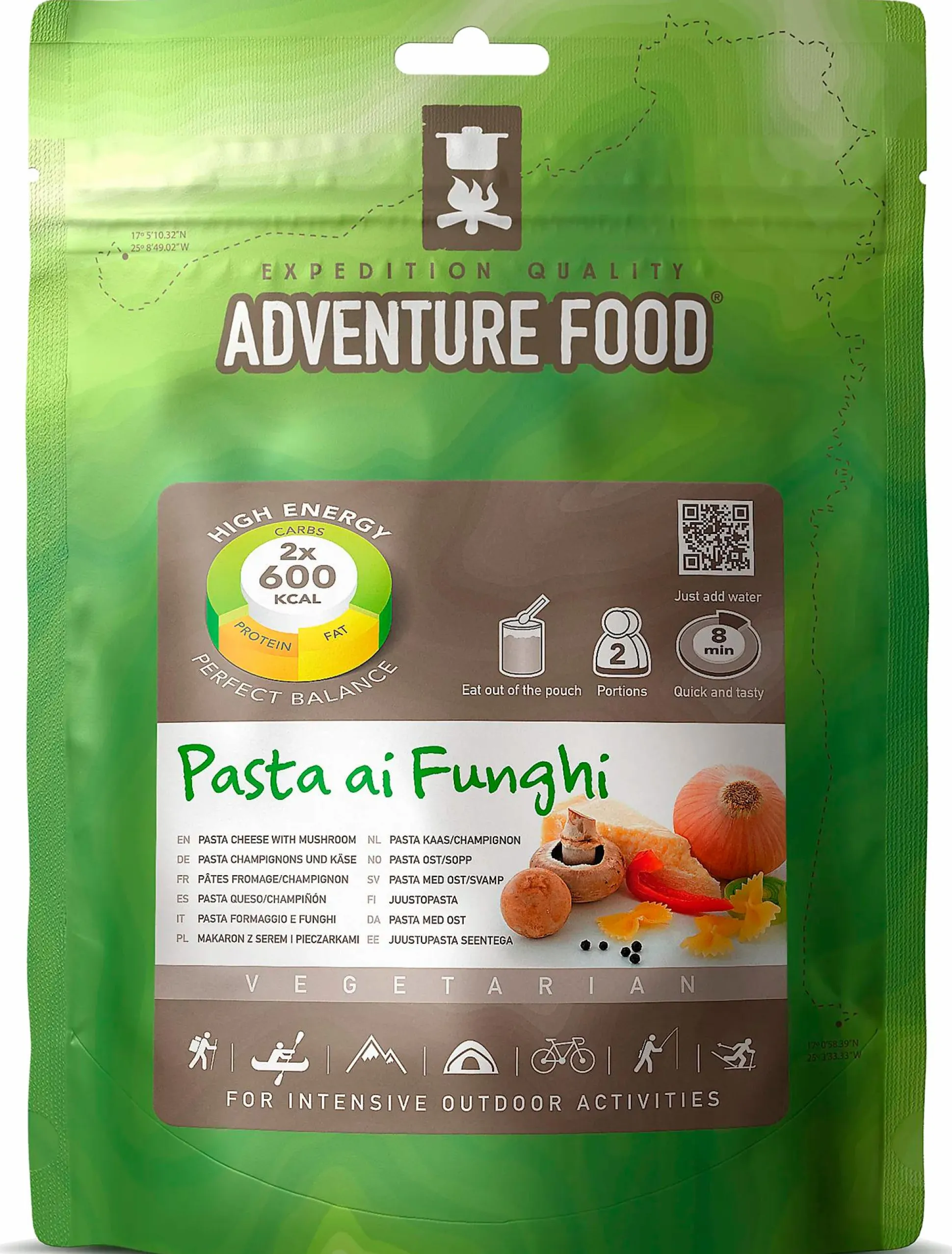 Adventure Food on laadukkaita pakastekuivattuja aterioita sisältävä sarja niille, jotka vaativat paljon sekä ravintosisällöltä että maukkaudelta. Sarjan ovat kehittäneet ammattilaisvuorikiipeilijät, jotka tietävät, mitä tarvitaan jaksamiseen retkillä esim. K2:lla ja Mount Everestillä. Valmistus: 1. Avaa pussi merkinnän kohdalta. Levitä pohjaosa auki. Poista ”hapenpoistaja”. 2. Lisää kuumaa vettä viivaan 22 asti (0,8 l). 3. Sekoita hyvin. 4. Sulje pussi. Anna vetäytyä 8 minuuttia. 5. Sekoita. 6. Valmis syötäväksi.
