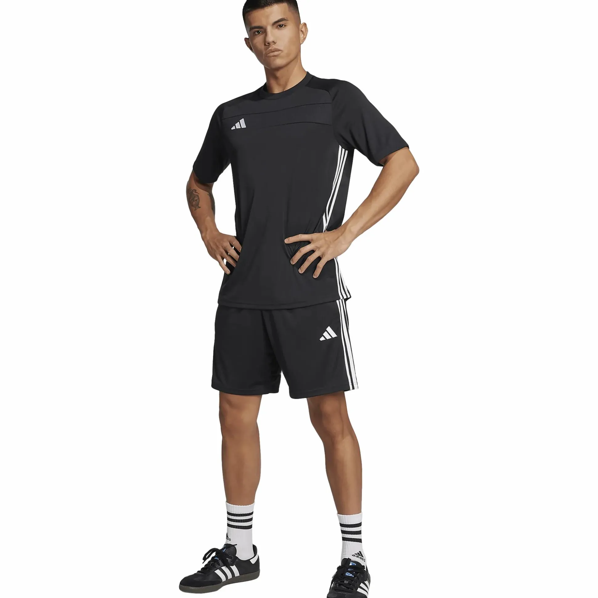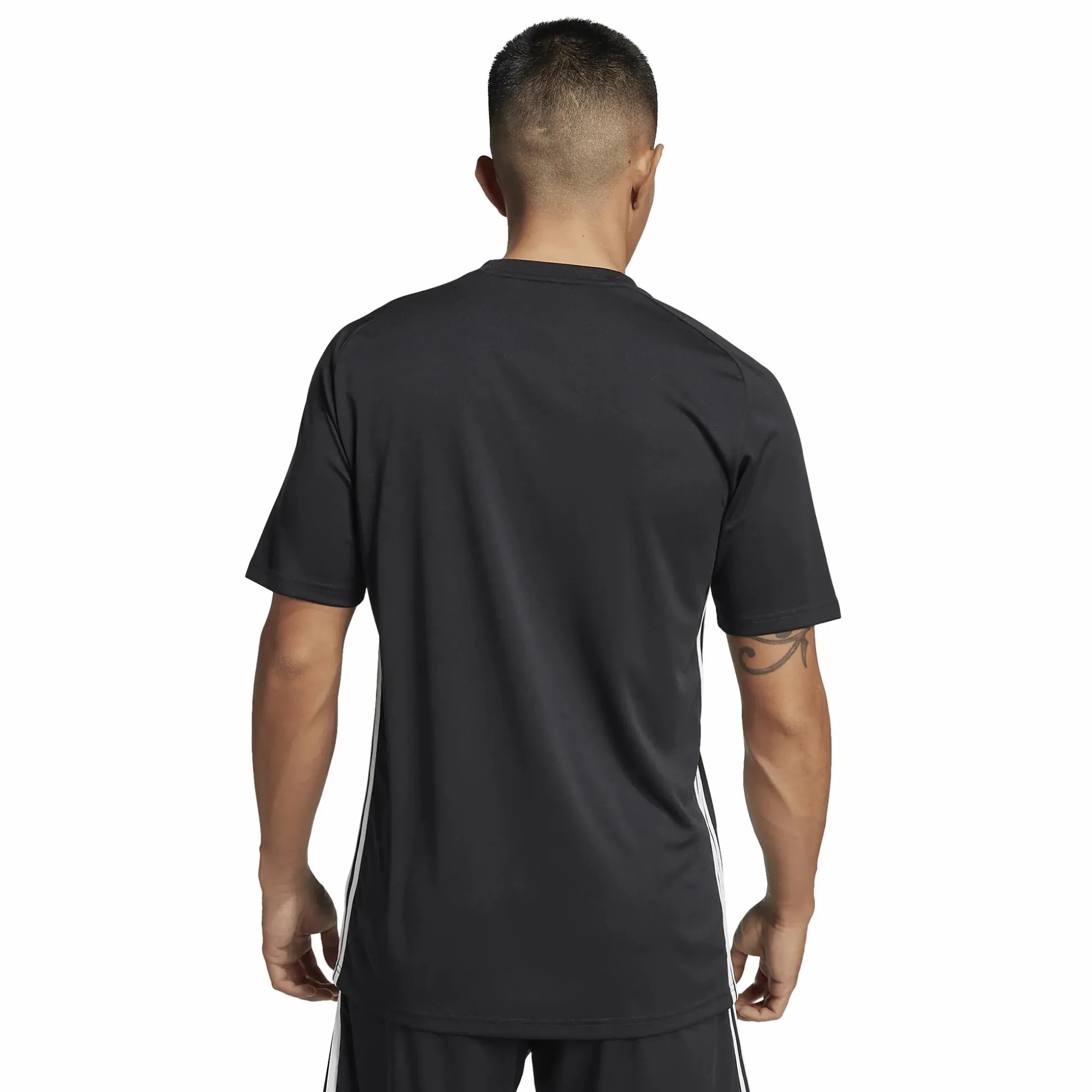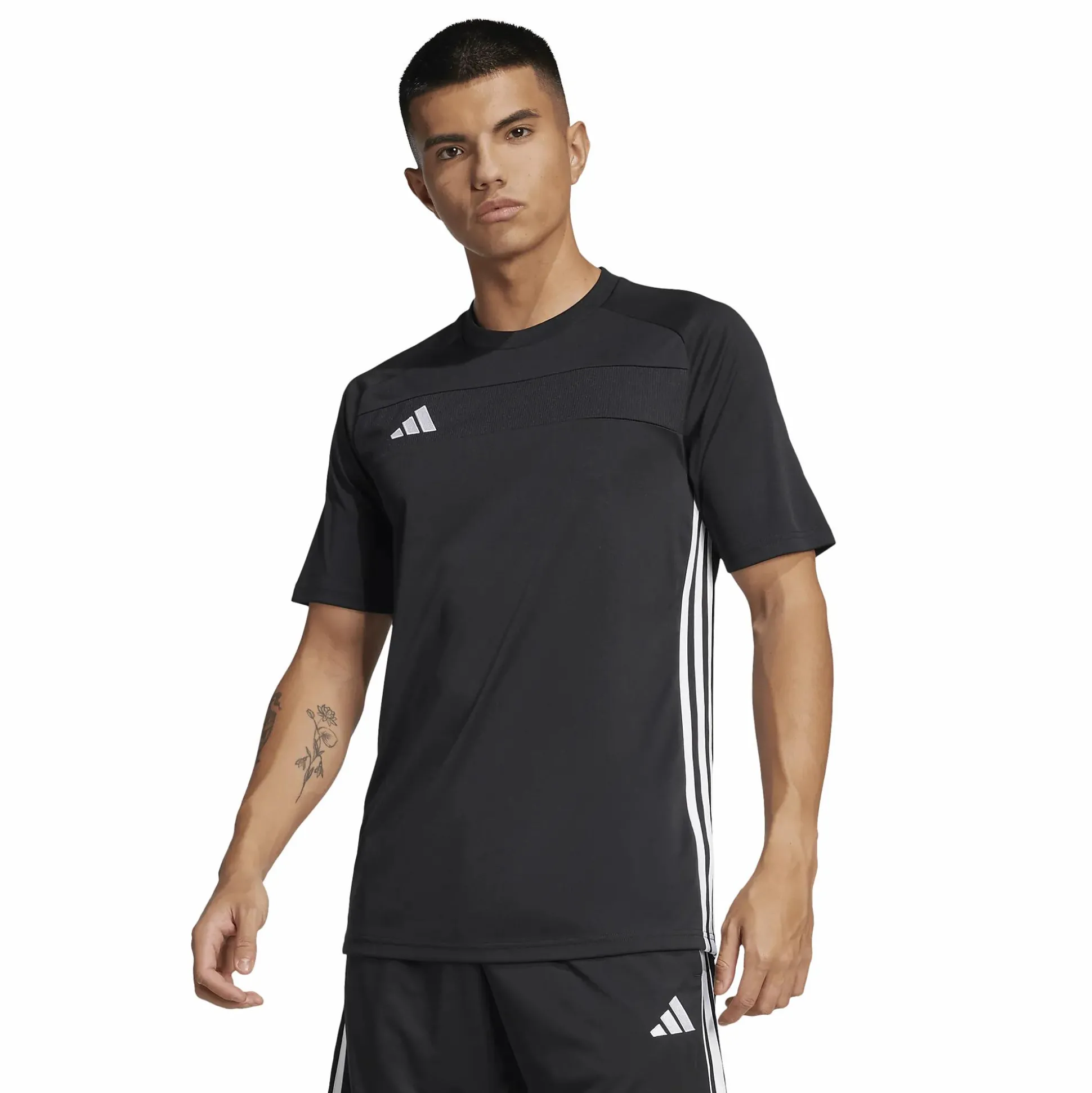 Tiro 25 Essentials Jersey adidakselta on kapeampi jalkapallopaita, joka on valmistettu pehmeästä, kierrätetystä polyesteristä. Klassinen Tiro-tyyli korostuu sivuilla olevilla 3-Stripes-raidoilla ja adidas 3 Bar -logolla rinnassa, mikä tekee siitä sopivan sekä harjoitteluun että arkikäyttöön. Paidassa on pyöreä pääntie, joka tarjoaa mukavan istuvuuden ja tyylikkään siluetin, joka toimii monissa tilanteissa – sekä kentällä että sen ulkopuolella.